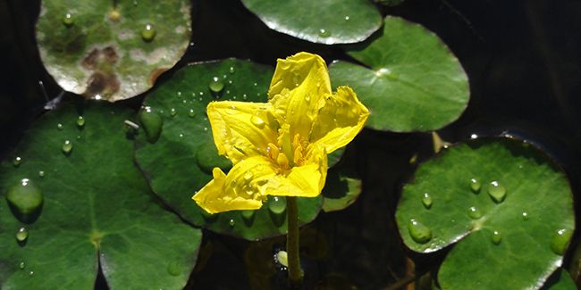 En été, ses fleurs jaunes dorées, à cinq pétales frangés et en forme d'entonnoir, émergent au-dessus de la surface, ajoutant une touche ornementale.