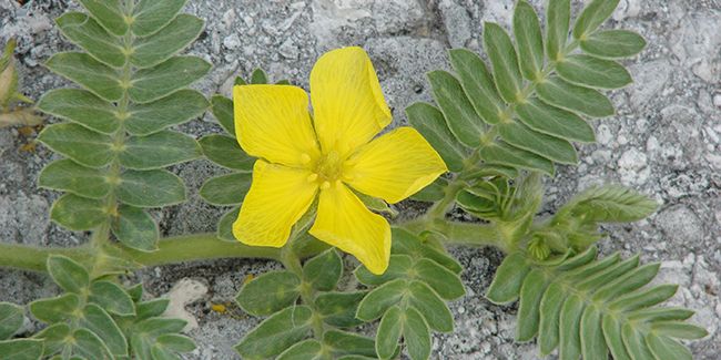 Avec ses divers noms tels que tribule terrestre, croix de Malte ou chota-gokhru, Tribulus terrestris est une plante herbacée vivace. Elle se développe dans les sols arides et chauds, possédant une racine pivotante qui lui permet de puiser l'humidité en profondeur. Ses tiges rampantes, pouvant s'étendre sur plus d'un mètre, la rendent parfois envahissante dans certaines régions. Ses petites feuilles ovales et ses fleurs jaunes, qui s'épanouissent d'avril à septembre, donnent des fruits épineux très durs, dont les graines peuvent germer durant jusqu'à sept ans.