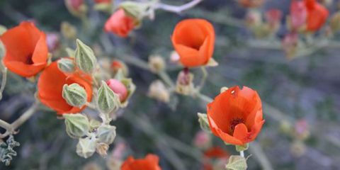 De mai à octobre, la mauve du désert affiche des fleurs en coupe d'environ 3 cm de diamètre, avec cinq pétales d'un orange éclatant et des étamines jaunes serrées au centre. Lorsque la chaleur estivale est intense, la floraison peut faire une pause, mais reprend en fin d'été, attirant ainsi de nombreux insectes pollinisateurs. Les fleurs produisent ensuite des fruits, permettant un semis spontané lorsque les graines s'en libèrent.